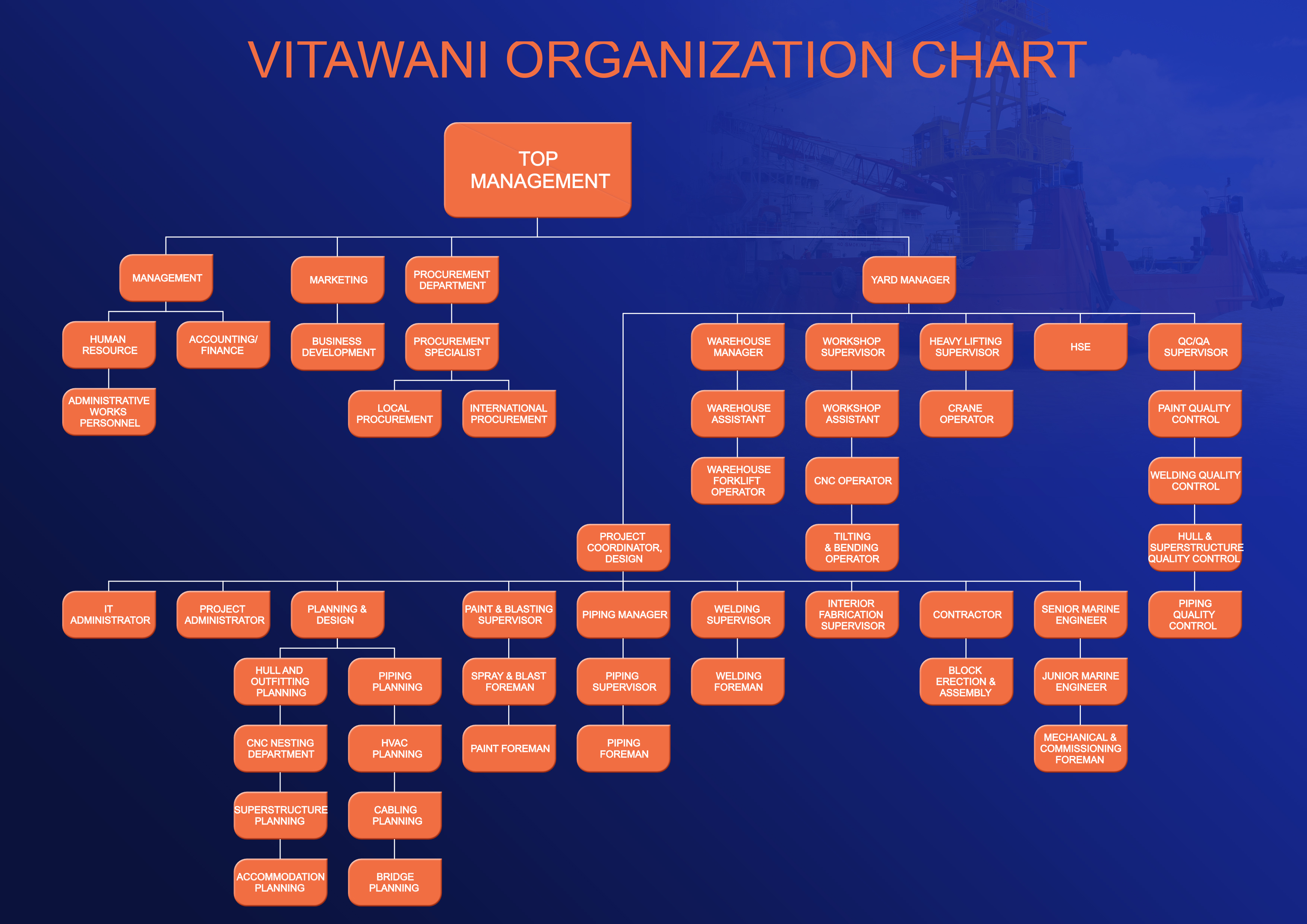 Vitawani's organisation structure has streamlined series of business operations, and established a comprehensive business decision making process. It allows vitawani to create management chain to ensure all business locations operate according to the company's standard procedures.
